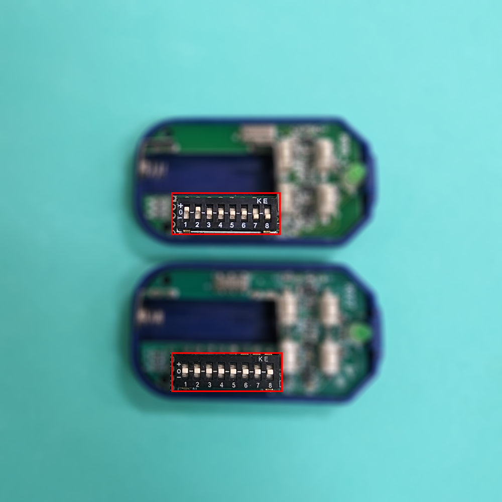 1. 先將新購入遙控器的指撥開關整排撥到與原配遙控器的指撥開關相同。