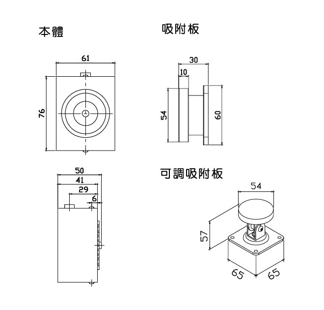 -DH-65TR:此機種具DH-65T功能,搭配可調式吸附板,適用於門扇與牆面夾角大於5度時使用。